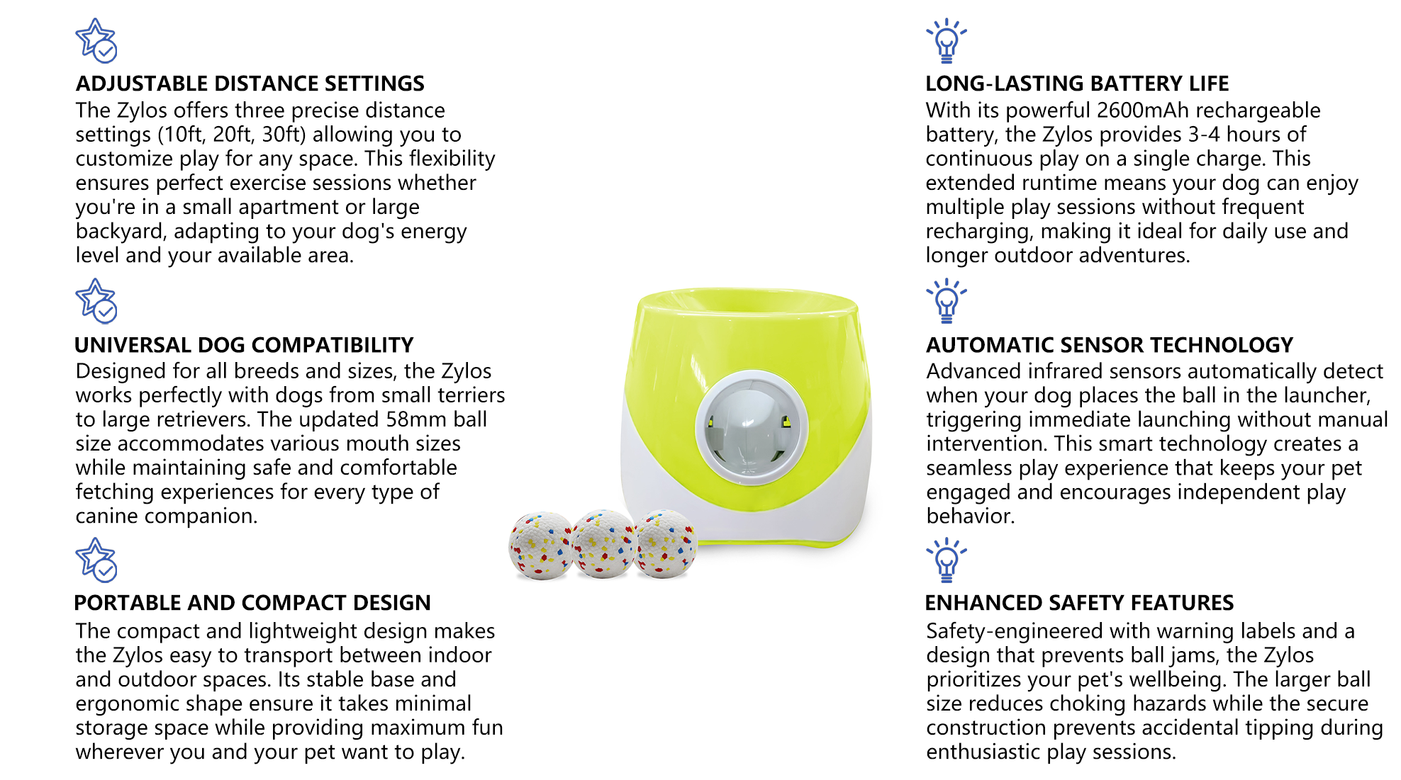 The Zylos Dog Ball Launcher solves the challenge of finding time for regular play sessions by providing automatic ball launching that keeps your dog engaged and active even when you're busy. This innovative toy ensures your pet gets the physical and mental stimulation they need for optimal health and happiness.