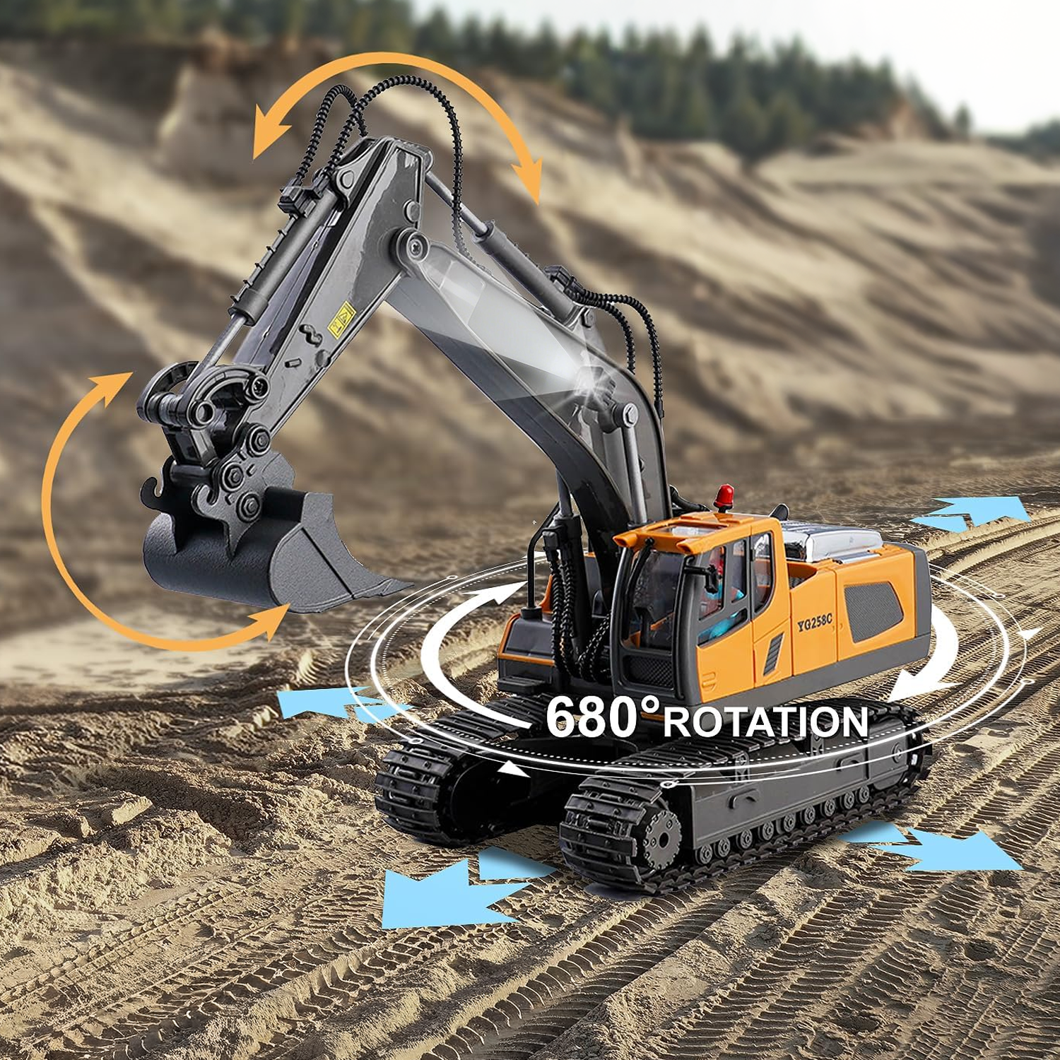 680° Controllable Rotation introduces a higher level of strategy to your remote control challenges. You can park the excavator in the optimal position, then utilize its broad range of rotation to plan the most efficient digging path and dumping points.