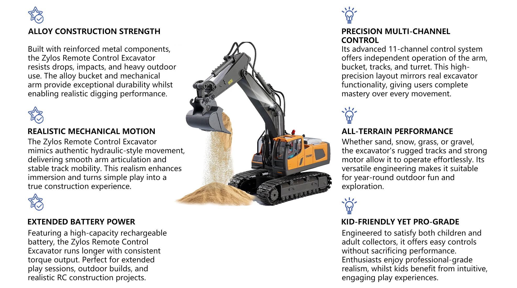 The Zylos Remote Control Excavator uses an alloy bucket and strong motors, allowing it to scoop real dirt, sand, and stones with impressive accuracy and genuine digging power.