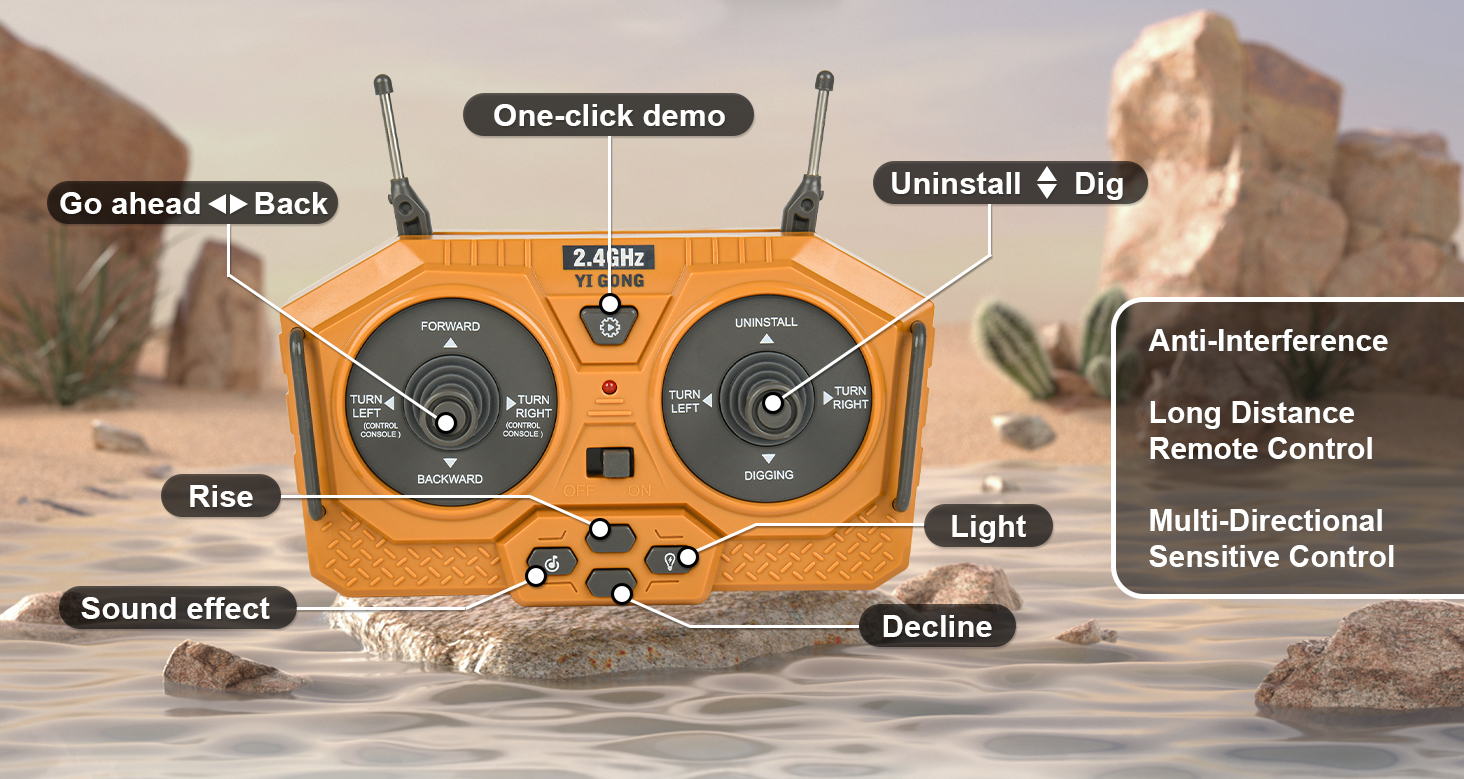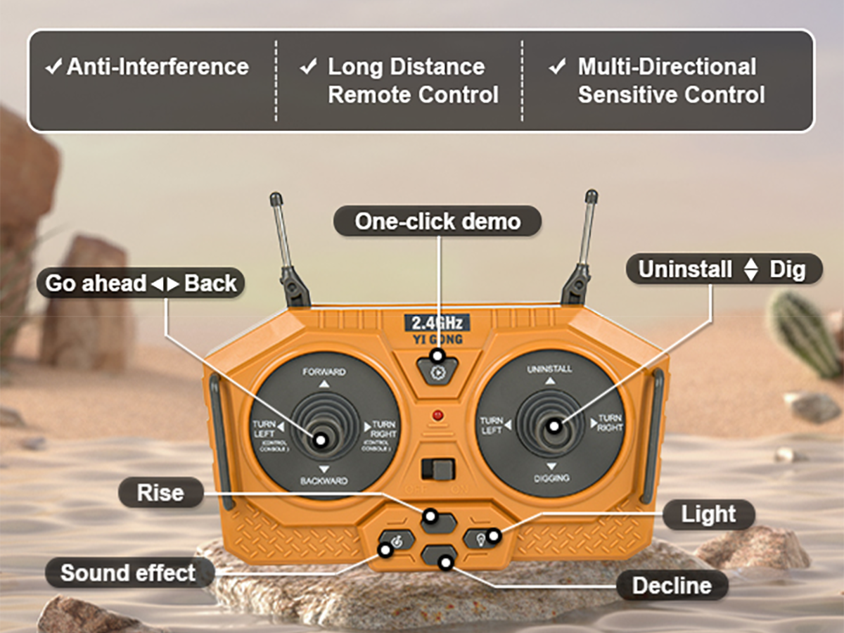 The controller supports 360° rotation, bucket lift, arm extension, lighting control, sound effects, and one-button demonstration mode for easy operation and enhanced realism.